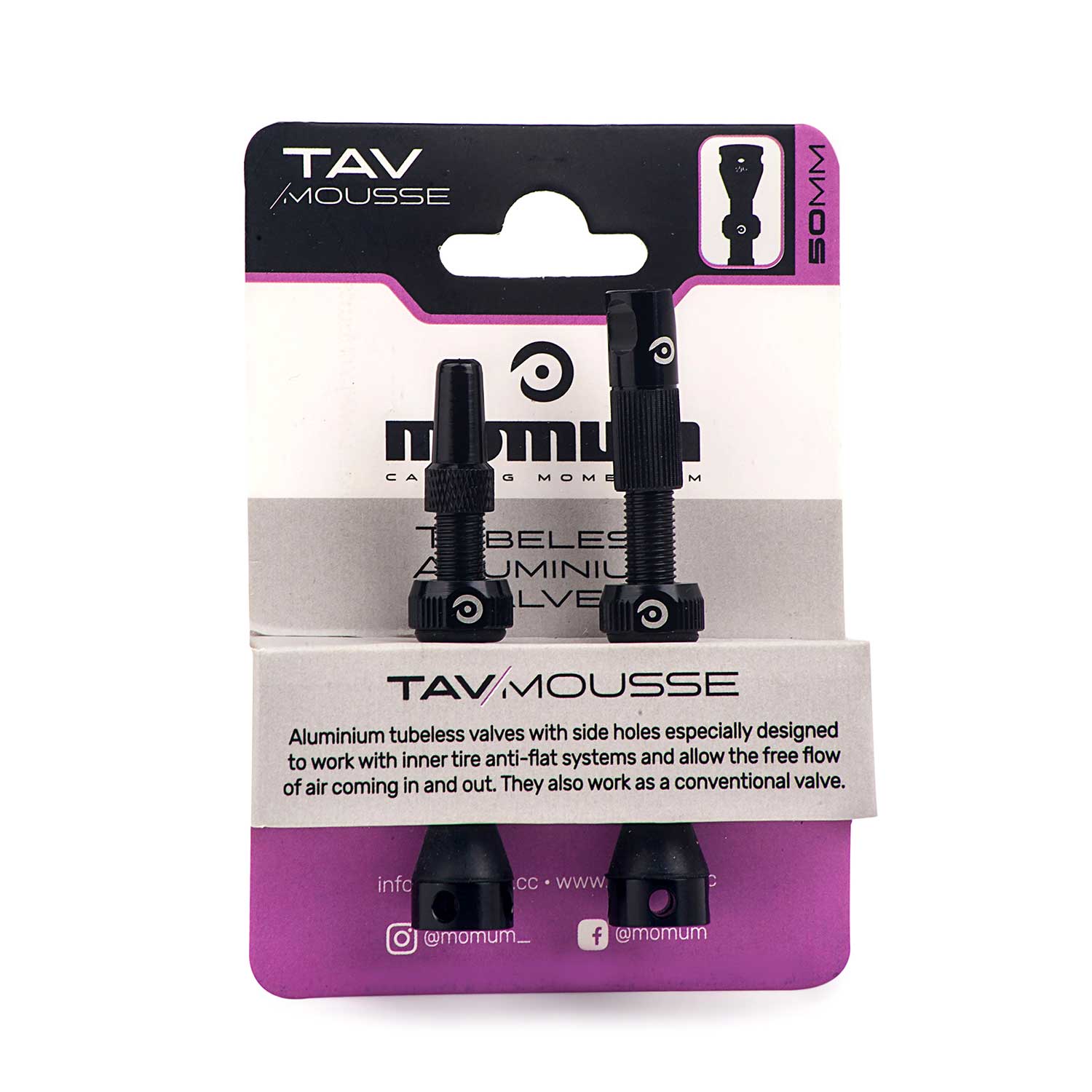 Las nuevas tendencias obligan a desarrollar nuevas funciones que mejoran la experiencia general del usuario. TAV Mousse es la versión de nuestras Válvulas de Aluminio Tubeless especialmente diseñadas para ciclistas que utilizan sistemas de mousse en sus neumáticos. Los agujeros laterales en su base de aluminio evitan que la mousse bloquee el libre flujo del aire que entra y sale del neumático. También funcionan como una válvula convencional.